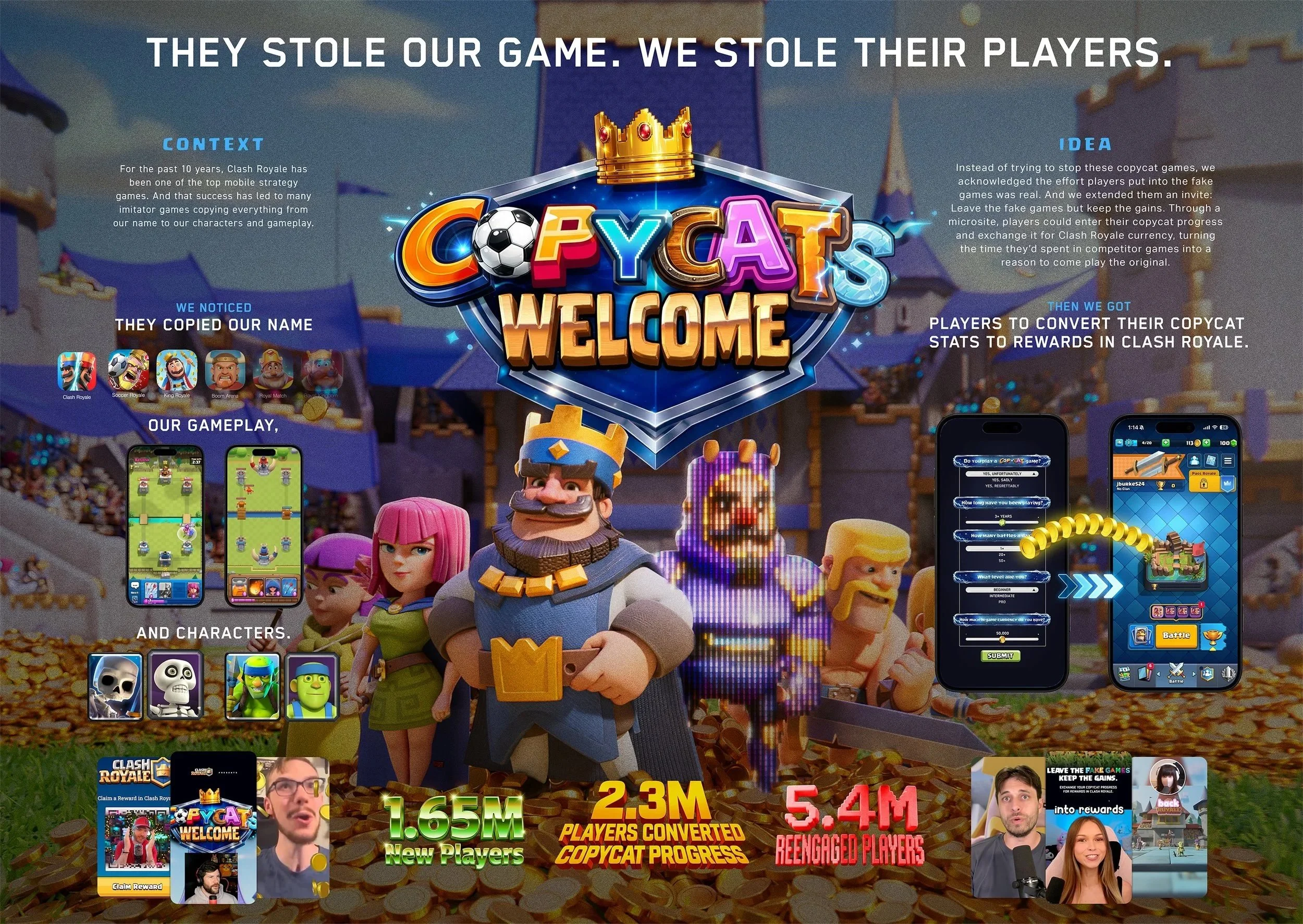 Clash Royale is one of the top mobile games. Which means there are a lot of games ripping off its style, characters, and even its name. Clash Royale could have sued them. But instead, we took a different approach. They stole our game. So we stole their players.